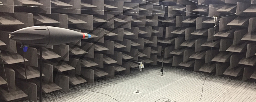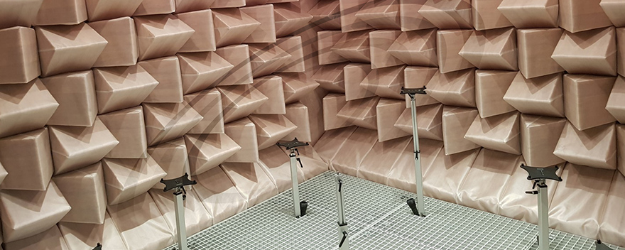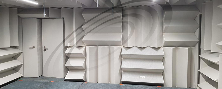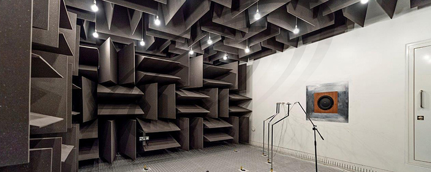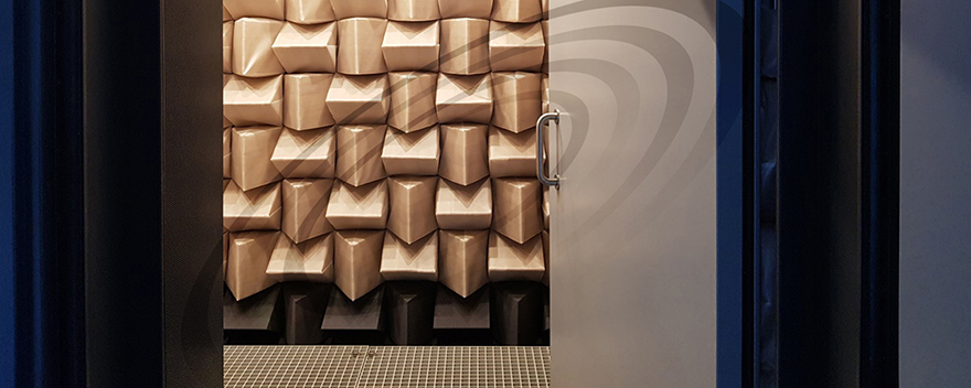 IAC所建設(shè)的全消聲室為研發(fā)工程師提供了精確的聲學(xué)測試自由場。試驗室具有優(yōu)異的隔聲性能,墻體的六個表面均安裝有吸聲尖劈,并同時配套地網(wǎng)以滿足人員、設(shè)備通行的需求。IAC Metadyne?(金屬吸聲尖劈)及特制泡沫尖劈能夠以其優(yōu)異的吸聲性能為消聲室內(nèi)提供理想聲學(xué)環(huán)境。